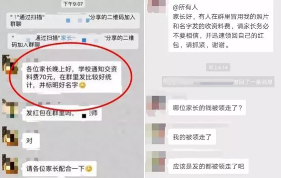 今年5月,在福建省安溪县某小学五年级一班的微信群里,有人发布上述通知,19名家长陆续交了“资料费”后发现受骗报警。