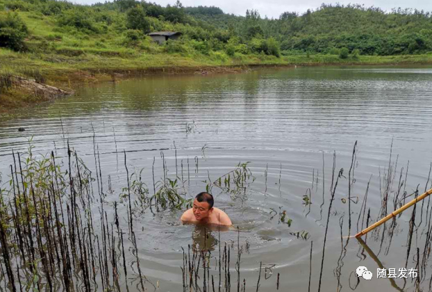 这是高城镇微信工作群中一段视频主人公的对话,展示的是三清观村党支部书记杨明主指导党员干部邓小波水中踩剅保水的一幕。在随州农村,人们称封闭输水管为踩剅。