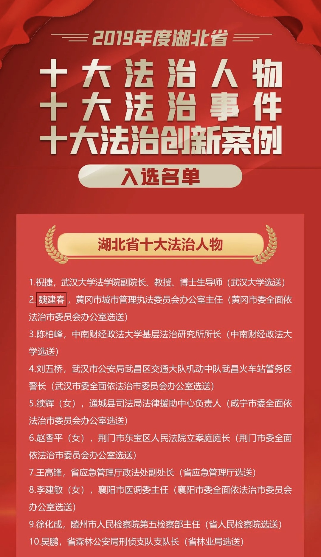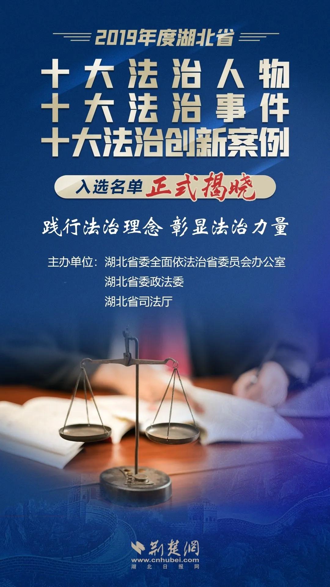 经过网络投票、专家组评审、评审委员会审定和名单公示等程序,30名(件)来自立法、执法、司法、守法普法、法律服务、法学研究等领域的先进法治人物、典型法治事件和优秀法治创新案例脱颖而出,入选2019年度“湖北省十大法治人物 十大法治事件 十大法治创新案例”,另外30名(件)候选对象获2019年度“湖北省十大法治人物 十大法治事件 十大法治创新案例”提名奖。