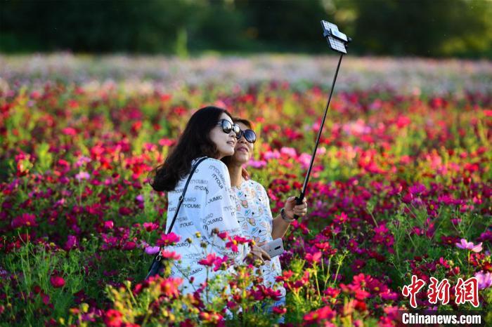 资料图:图为游客在格桑花花海拍照游玩。 王斌银 摄