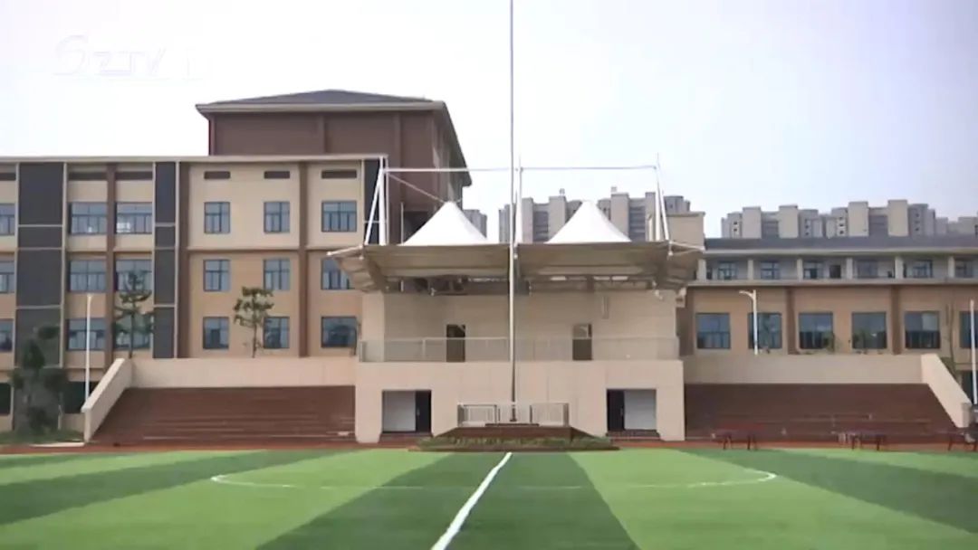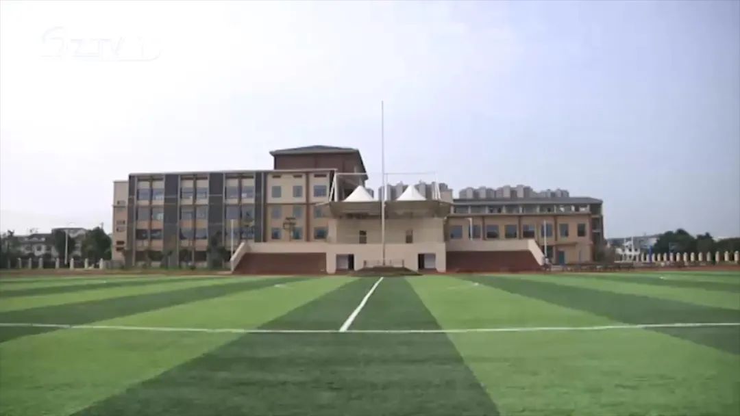 校园建筑结构紧凑、动静分离。综合楼旁是一应俱全的悬浮塑料地板篮球场、弹性塑胶运动场跑道,以及人造草坪足球场。