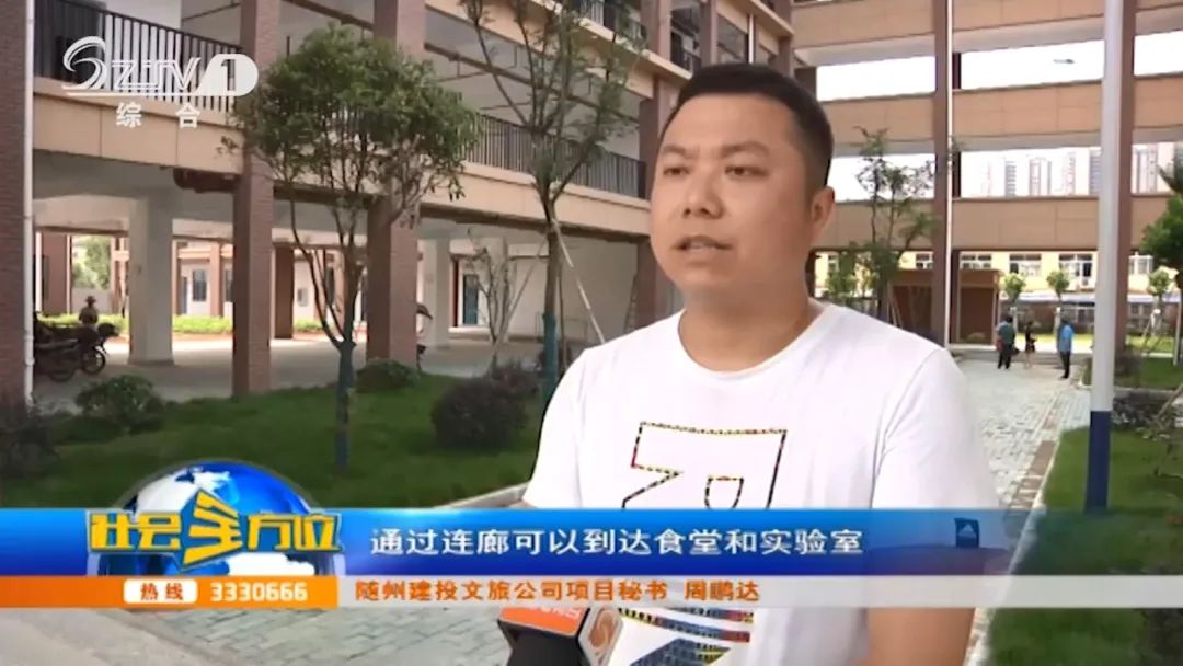 【采访】随州建投文旅公司项目秘书 周鹏达:学校的整体建筑是由综合楼跟教学楼组成的一个U型建筑,并且由长廊连接了一个食堂、一个实验室。在建设初期,考虑到小学适龄的学生年龄都比较小,所以在雨季跟雪季的时候,通过连廊可以到达食堂和实验室,使学生们可以在足不出户的情况下,满足他们的日常教学以及生活的需求。