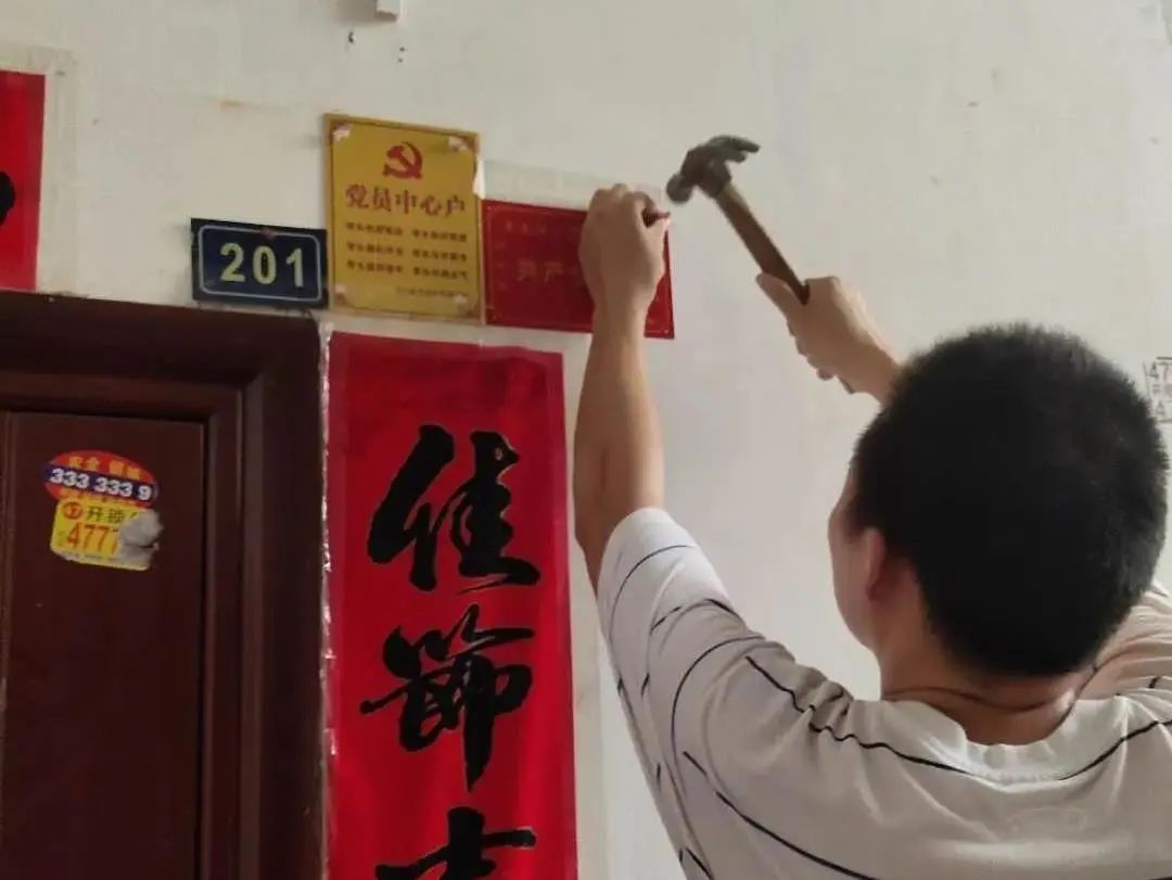 近日,东城办事处舜井道社区楚湘小区里,社区工作人员正在为党员王广宏家门口悬挂“共产党员户”标牌,鲜红的标牌上还写着“不忘初心,牢记使命,树形象,作表率”等字样。