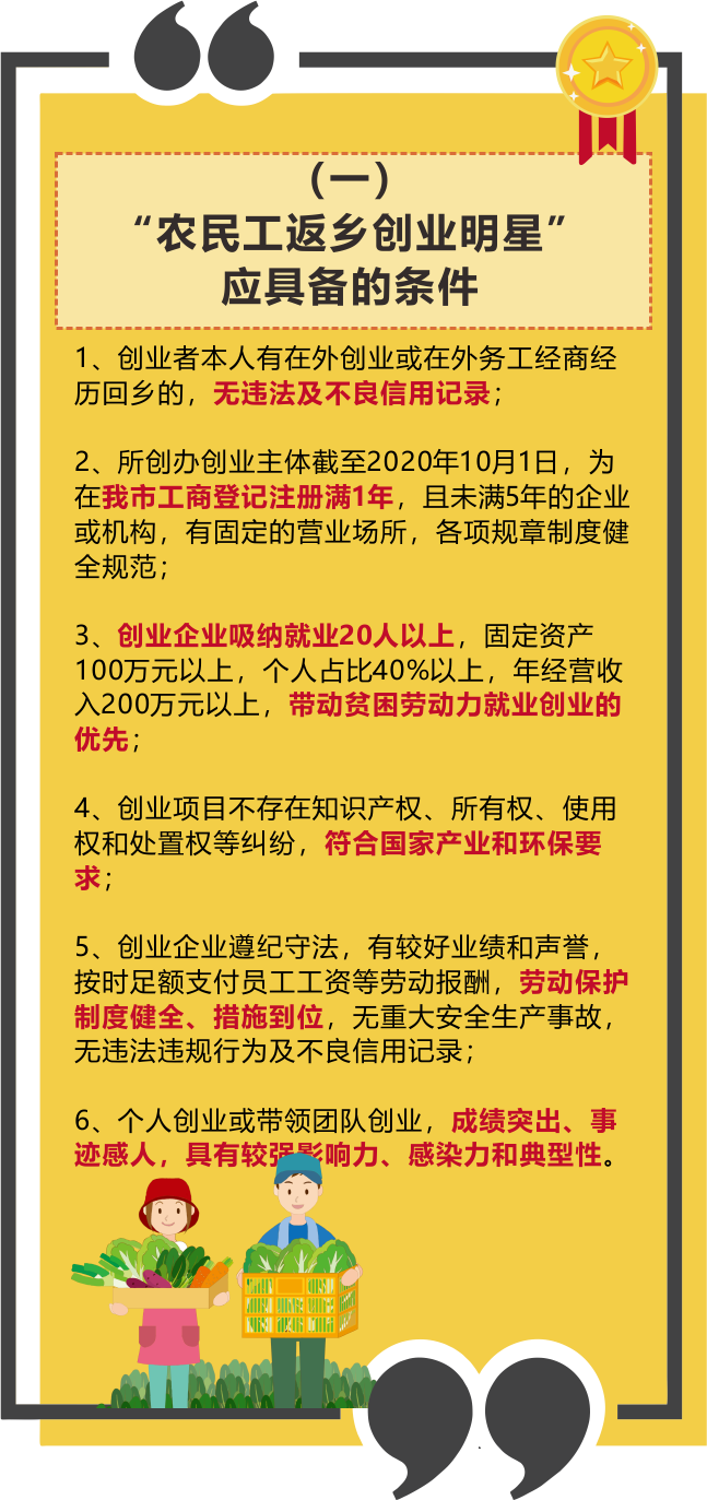 从人社部门了解到,对获得“农民工返乡创业明星”和“大学毕业生回乡创业明星”表彰人员,将给予一定奖励;同等条件下,优先推荐申报国家、省级大学生和返乡创业扶持项目;优先入驻各级创业孵化示范基地(园区),享受有关优惠扶持政策。