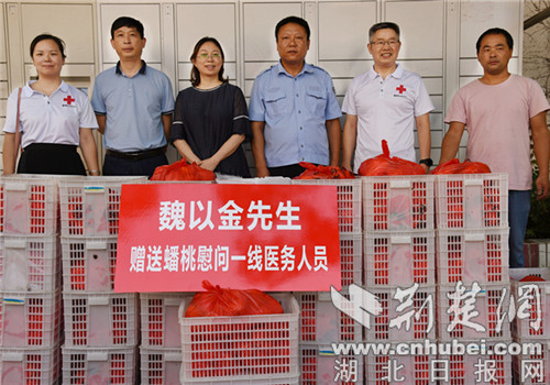 据了解,魏以金当天通过广水市红十字协会先后向19家医疗机构和社会福利院捐赠蟠桃500余箱,共计达6000余斤。