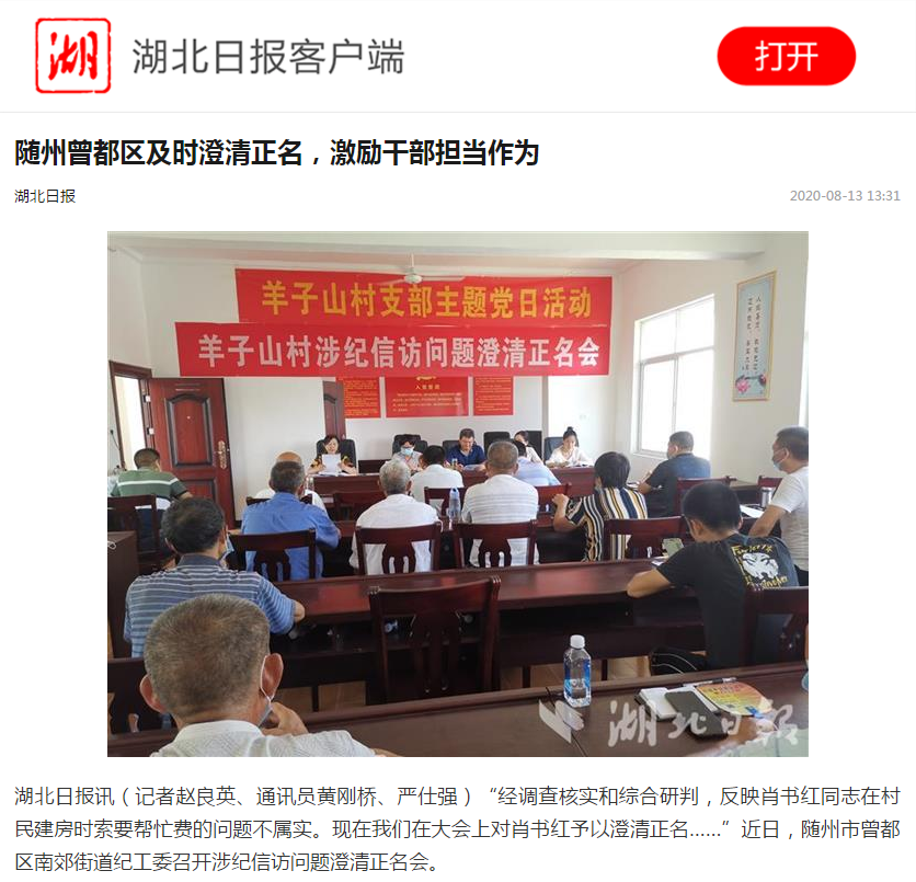 “经调查核实和综合研判,反映肖书红同志在村民建房时索要帮忙费的问题不属实。现在我们在大会上对肖书红予以澄清正名……”近日,随州市曾都区南郊街道纪工委召开涉纪信访问题澄清正名会。