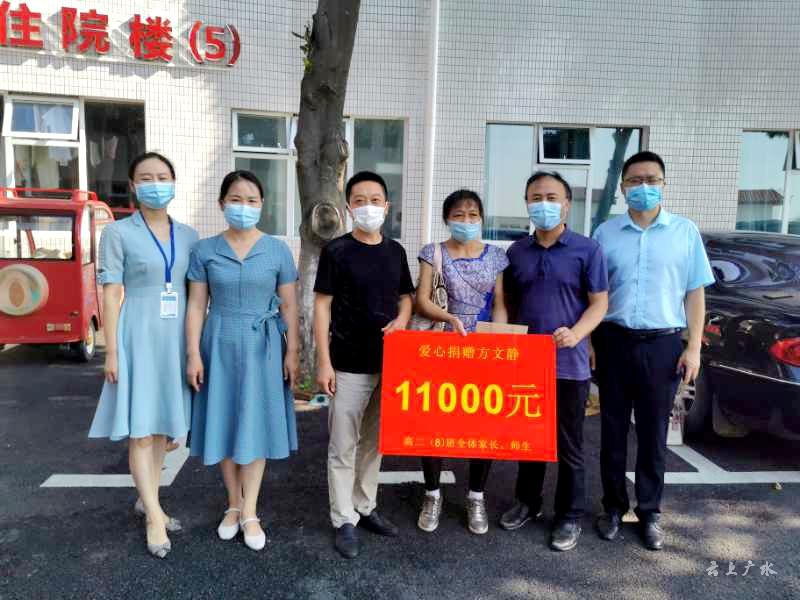 此次爱心捐赠活动,广水市一中相关负责人及学工处、团委捐款共2200元;方同学所在班级高二(8)班全体师生、家长捐款共11196元;广水市二医院感染科全体医护人员为方同学捐款共2400元。