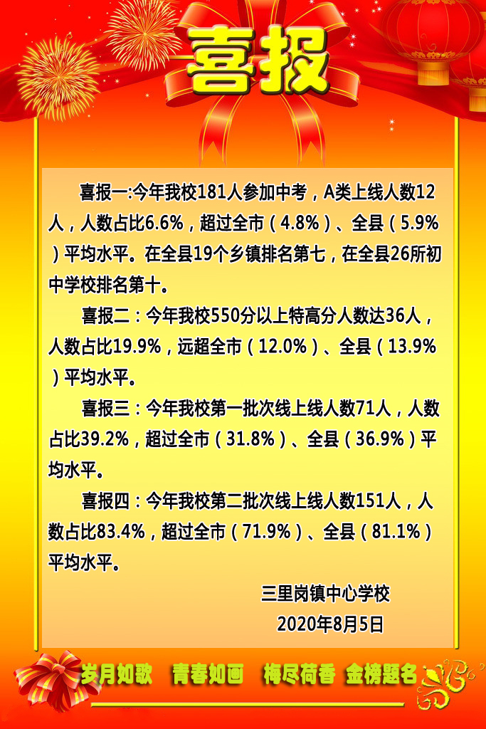 鲲鹏久有凌云志,硕果飘香又一年。不平凡的2020年,团结奋进的菇乡教育人秉承脚踏实地教书、无私奉献育人的教育精神,用顽强拼搏的汗水和攻坚克难的勇气向全体师生和家长交上了一份精彩的答卷!三里岗镇中心学校2020年中考不负众望,再续辉煌。