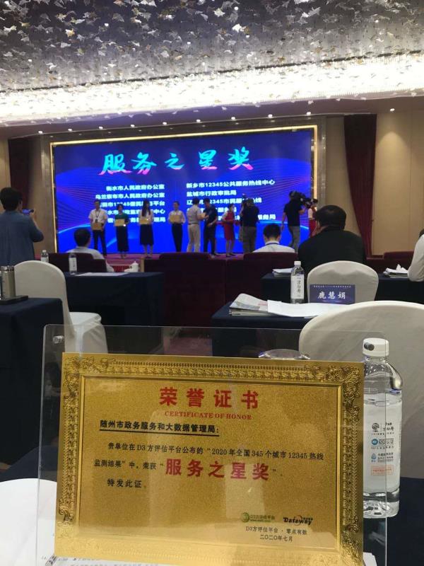 7月30日,第四届全国12345政府热线年会隆重召开,随州12345市长热线因贴近百姓生活、便民惠民而从全国345个参评城市中脱颖而出,荣获“服务之星奖”,随州12345市长热线成为湖北省唯一一个荣获该奖项的单位。本次年会是由D3方评估平台、零点有数软件公司和河南省驻马店市人民政府联合主办,中国标准化研究院、CC-CMM国际标准组织提供支持,每年发布全国政务热线运行质监量评价报告。