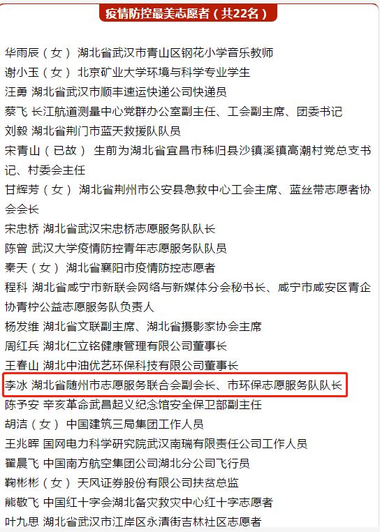 昨天上午,中宣部、中央文明办召开推进学雷锋志愿服务工作电视电话会议,公布2019年度学雷锋志愿服务“四个100”先进典型暨疫情防控最美志愿者名单。百名疫情防控最美志愿者中,湖北一共有22名志愿者当选,其中就有一个随州人。