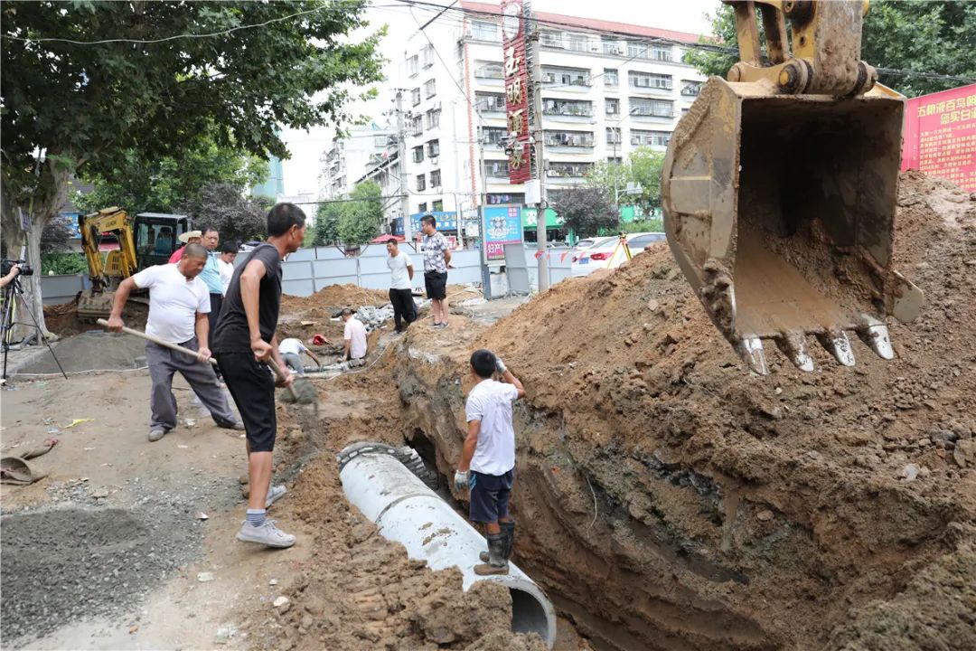 8月25日,在北郊街道办事处亚通社区亚通小区,挖掘机轰轰作响,工人们正在加紧铺设管道,一片忙碌的施工景象。