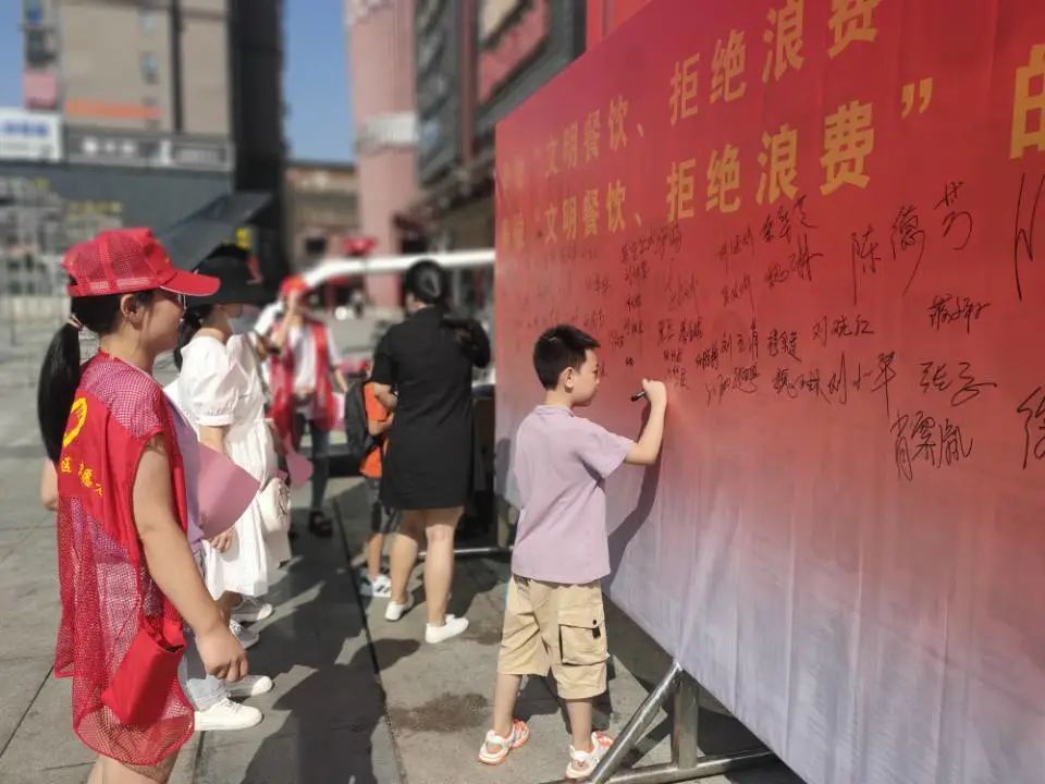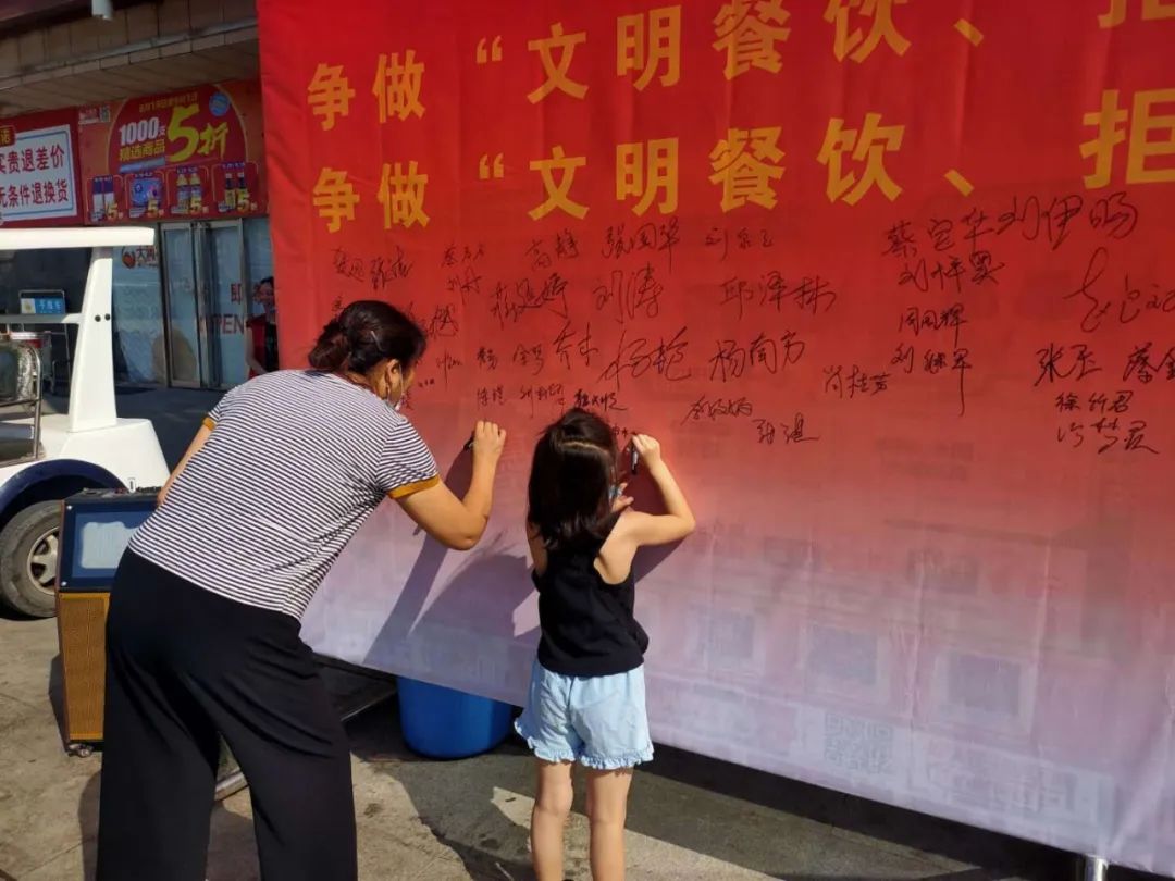 活动以摆放宣传版面、悬挂横幅、发放倡议书、播放录音、现场签名等形式举行。看到悬挂在超市门口的横幅,过往的居民以及附近的商户都纷纷加入到签名行列,在横幅上郑重签下自己的名字。大家表示,一个签名就是一份承诺,希望自己能够带动身边的家人朋友,向陋习告别,共同创建勤俭节约、健康绿色的明天。