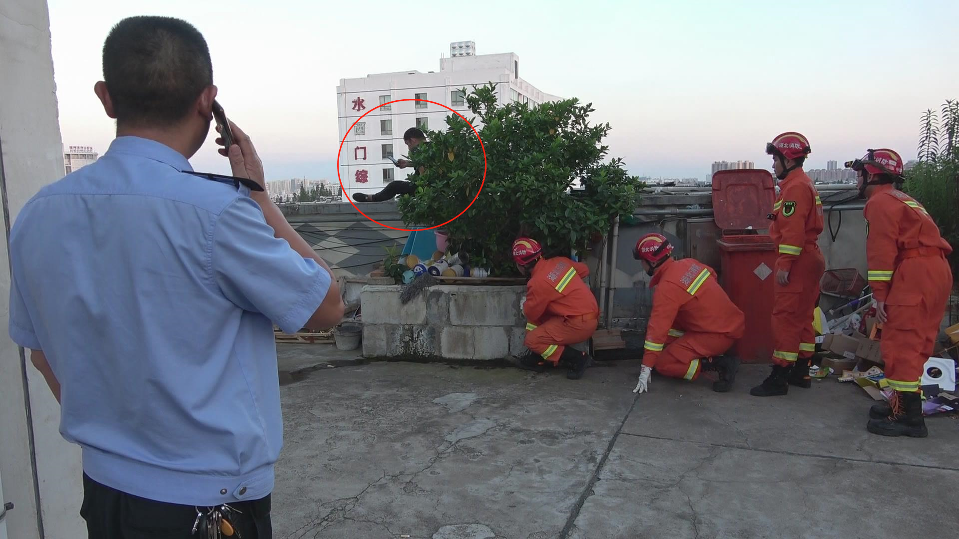 随州市消防救援支队东城特勤站政治指导员代子尧带队到达事故现场后,发现跳楼男子坐在六楼的围墙边,半边身体悬空,于是他们利用跳楼人员身后的树木做掩护 ,利用男子打电话的间隙 ,迅速将他抱下来。