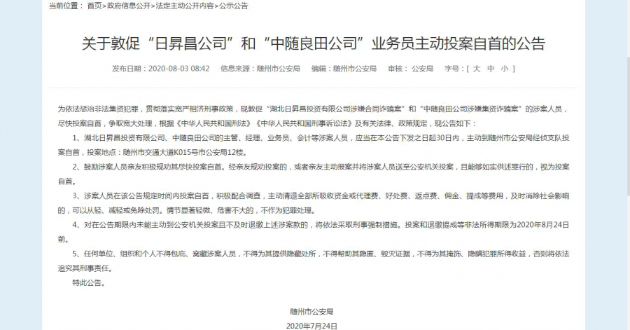 据悉,7月24日,随州市公安局下发《关于敦促“日昇昌公司”和“中随良田公司”业务员主动投案自首的公告》。依法惩治非法集资犯罪,贯彻落实宽严相济刑事政策,敦促“湖北日昇昌投资有限公司涉嫌合同诈骗案”和“中随良田公司涉嫌集资诈骗案”的涉案人员,尽快投案自首,争取宽大处理。