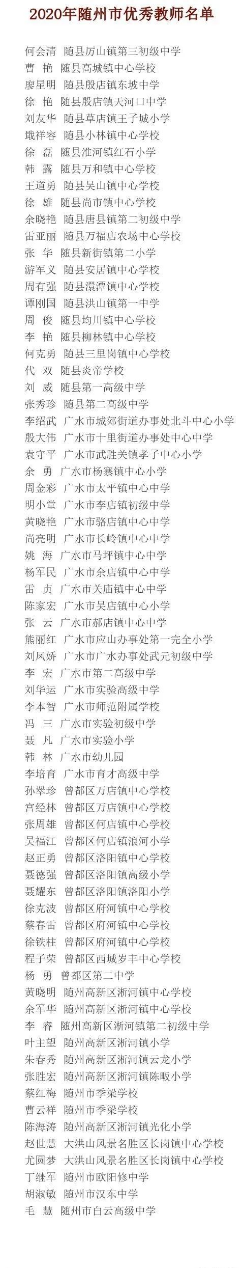 2020年教师节,随州市教育局决定对刘海军等10名“随州市师德标兵”、王思广等10名“随州市优秀班主任”、祝培举等10名“随州市优秀校长”、何会清等70名“随州市优秀教师”予以通报表扬(名单见附件)。