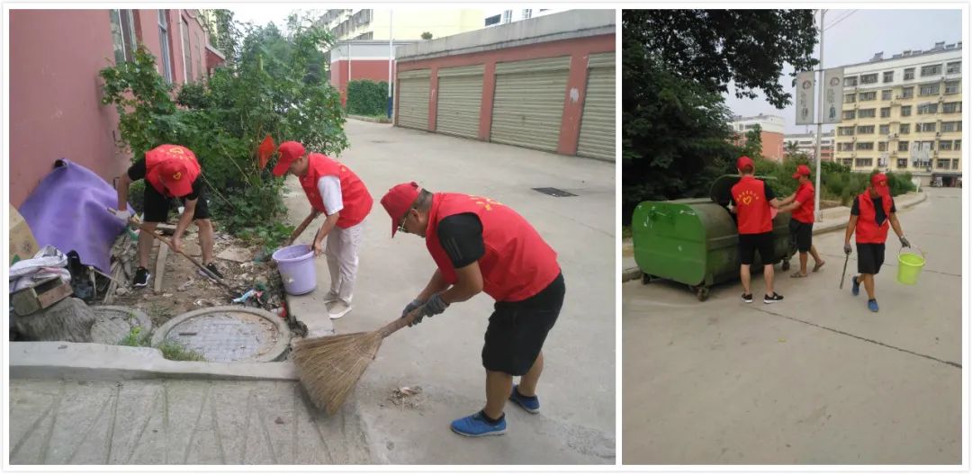 防疫有我,爱卫同行。爱卫运动小分队来到居民小区,开展清扫垃圾、杂草修剪、宣传垃圾分类知识等爱国卫生运动志愿服务活动。