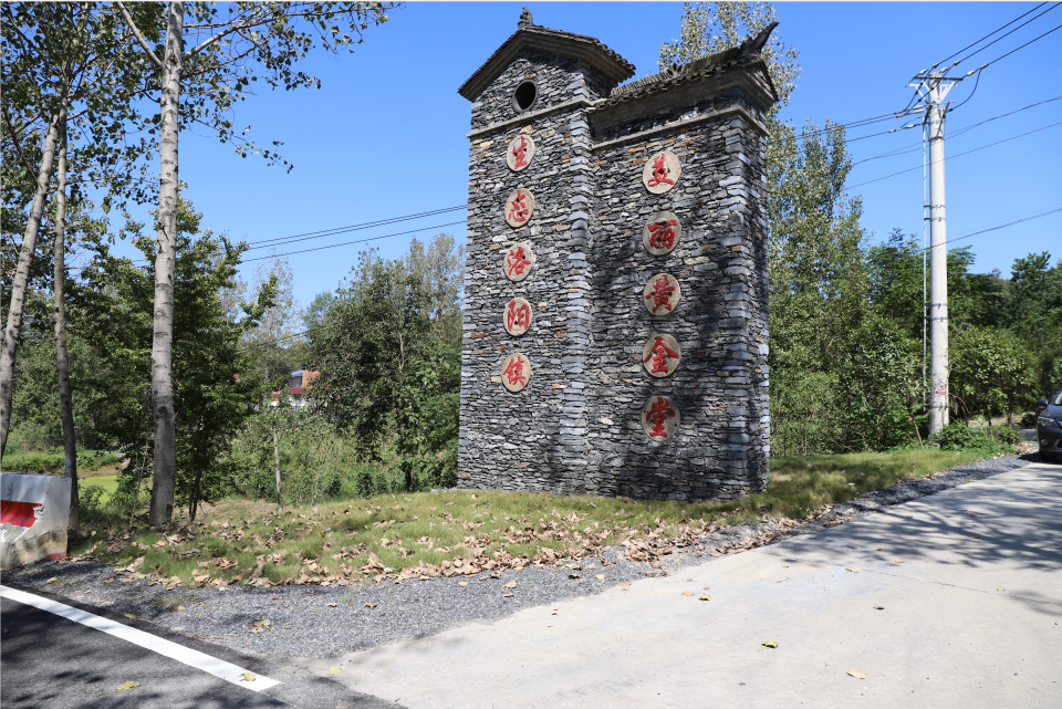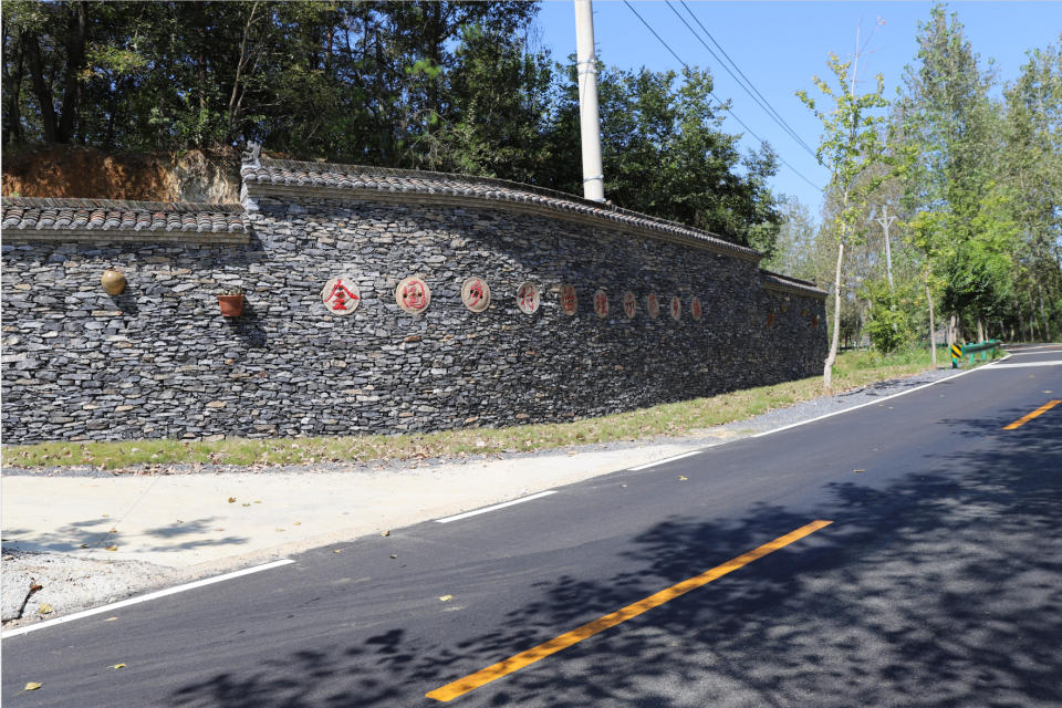 在洛阳镇黄金堂村,沿着洛府公路,有一处独特的建筑,一面全部由扁平石块砌成的石墙立在路边,印有“美丽家园”字样的纽扣状石块嵌在石墙中。这里是黄金堂村美丽乡村示范点郭家大塆。