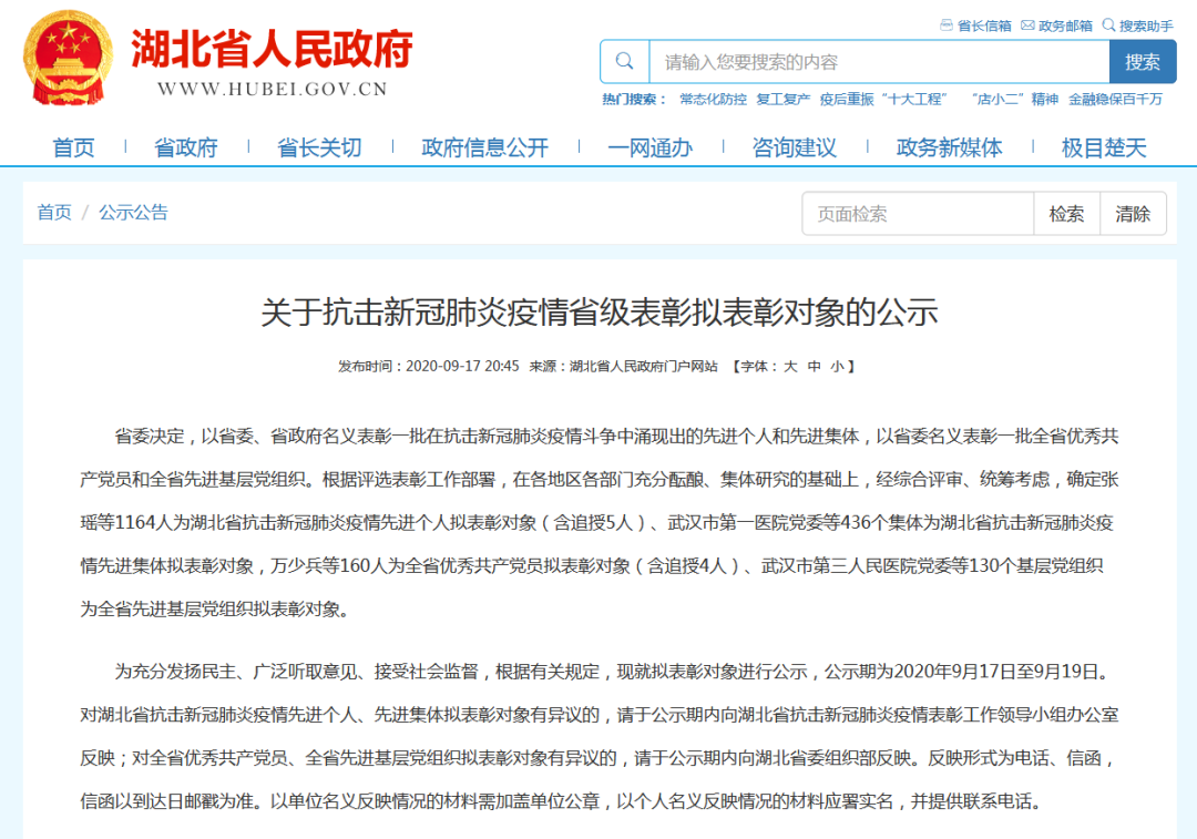 湖北抗击新冠肺炎疫情先进个人拟表彰对象1164人