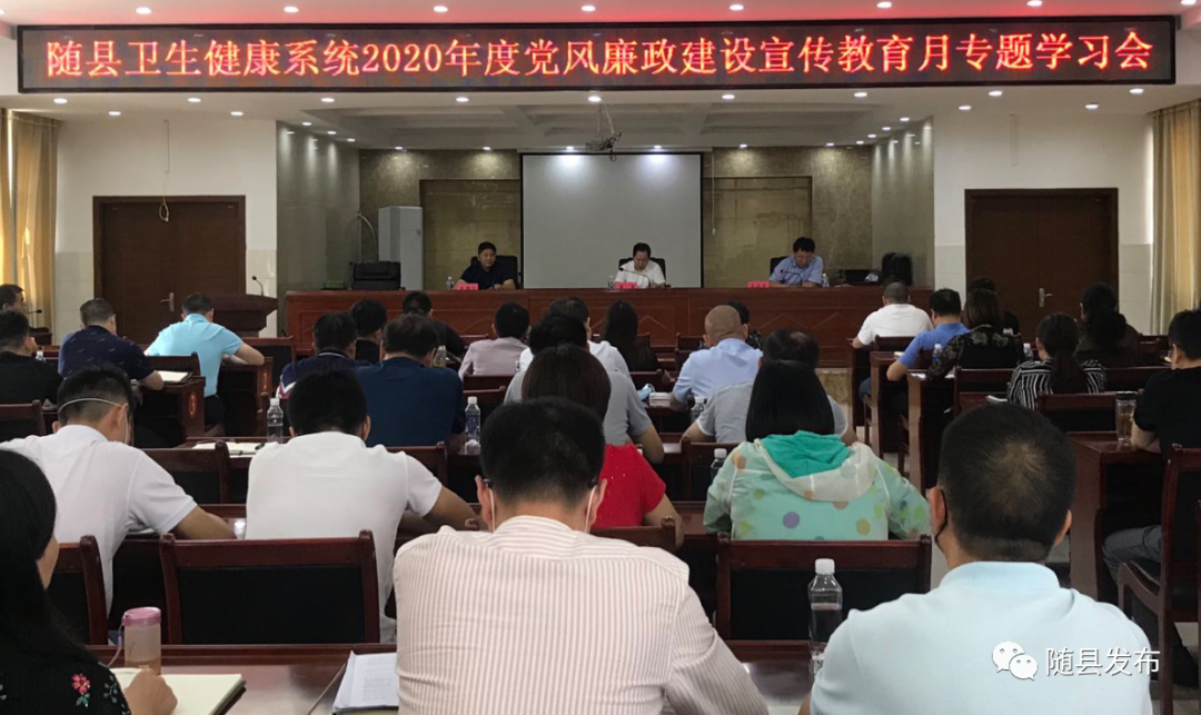 9月18日上午,随县卫生健康系统召开了党风廉政建设宣传教育月专题学习会。会议学习了《中华人民共和国公职人员政务处分法》《党员干部违纪违法典型案例警示录》,观看了《不忘初心 钟声示警》警示片,县卫健局主要负责人通过讲廉政党课,用身边案例教育身边人,督促依法用权、公正用权、廉洁用权。会议最后开展了《中华人民共和国公职人员政务处分法》知识测试,进一步检测学习效果,引导全体党员干部增强纪律、规矩意识和廉洁自律意识,提高拒腐防变能力,真正做到学懂、悟透、做实。通过开展党风廉政建设宣传教育月专题学习,广大党员干部纷纷表示受到了一次深刻的灵魂洗礼,要树立良好的党风、政风、行风,努力加强自身建设,树立卫生健康系统良好形象。(刘晓辉、曹伟、刘洋)