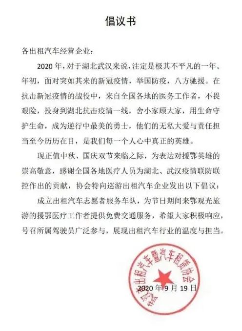 “来自全国各地的医务工作者,不畏艰险,投身到抗击疫情一线,舍小家顾大家,用生命守护生命,成为逆行中最美的勇士,他们的无私大爱与责任担当至今历历在目,是我们每一个人心中真正的英雄……协会特向巡游出租汽车企业发出以下倡议:成立出租汽车志愿者服务车队,为节日期间来鄂观光旅游的援鄂医疗工作者提供免费交通服务,希望大家积极响应,号召所属驾驶员广泛参与,展现出租汽车行业的温度与担当。”