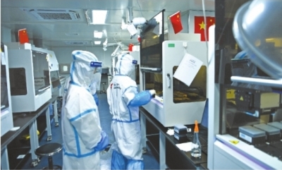华大基因“火眼”实验室内,全副武装的工作人员正准备对样本进行检测。