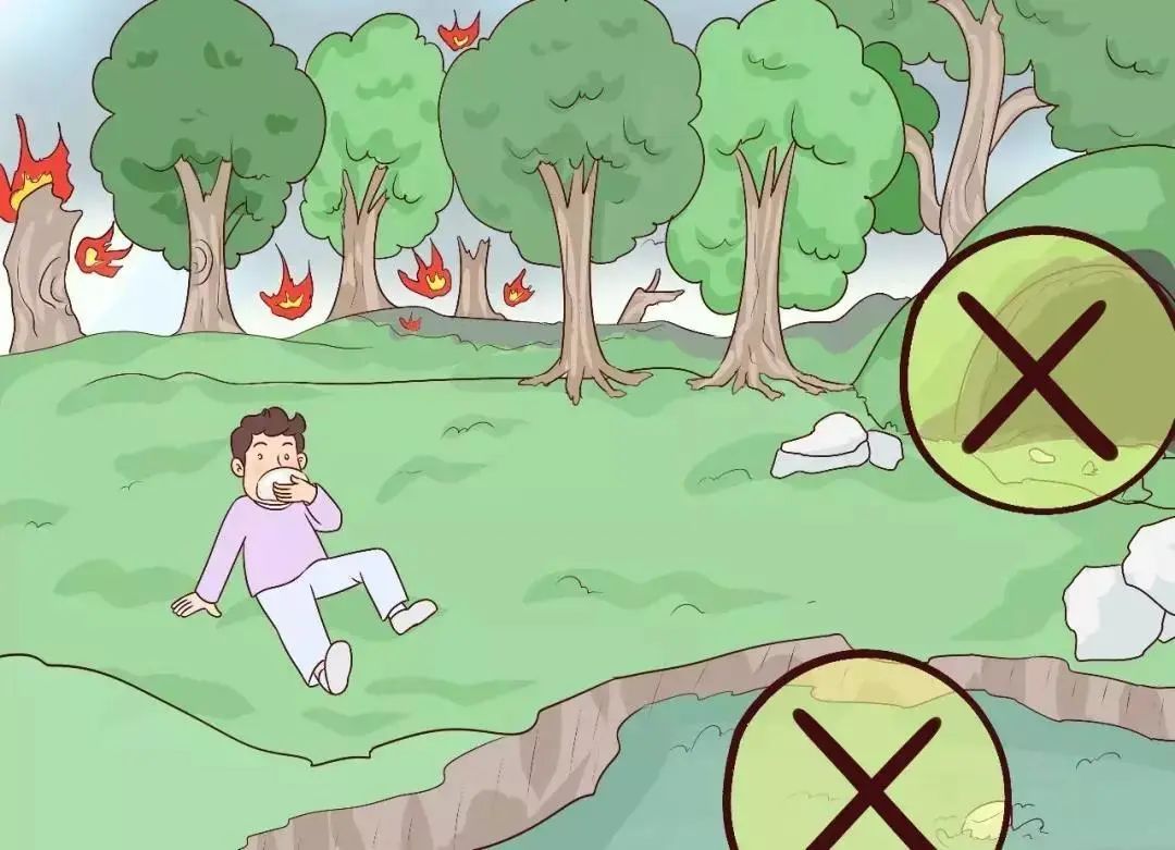 当烟尘袭来时,用湿毛巾或衣服捂住口鼻迅速躲避。躲避不及时,应选在附近没有可燃物的平地卧地避烟。切不可选择低洼地或坑、洞,因为低洼地和坑、洞容易沉积烟尘。