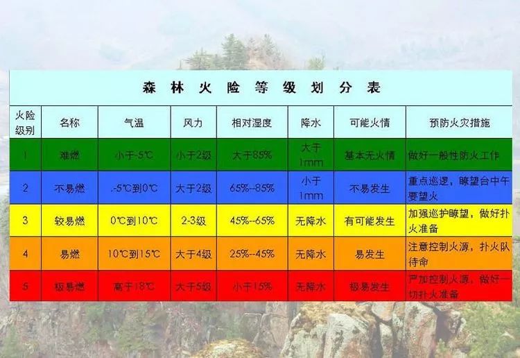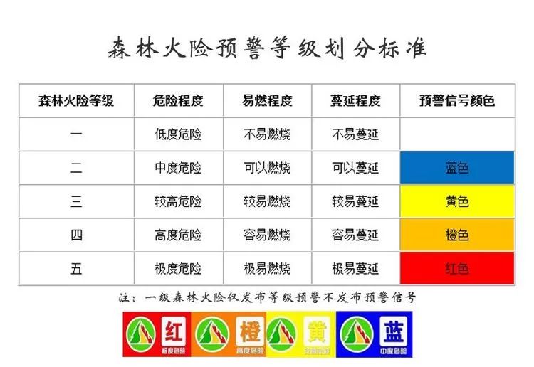 一级为难以燃烧的天气可以进行用火;二级为不易燃烧的天气,可以进行用火,但是可能走火;三级为能够燃烧的天气,要控制用火;四级为容易燃烧的高火险天气,林区应停止用火;五级为极易燃烧的最高等级火险天气,要严禁一切里外用火。