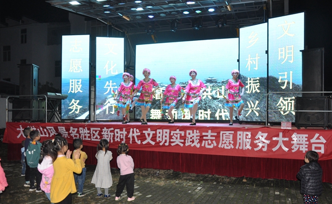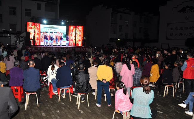演出定于当晚六点半开始,约六点,村民们就已被暖场的萨卡斯演奏陆续吸引到该区熊氏祠民俗村文化广场。村民们时而寒暄,时而拿出手机记录精彩的表演。演出在大洪山非遗项目《大洪山锣鼓演奏》表演中拉开帷幕,大洪山民歌《大洪山之歌》、《双探妹》用动人音符向大家展示出大洪山独特的文化底蕴,湖北大鼓《随州新貌》则是用其接地气的方言唱词奏出大洪山韵味,小品《垃圾分类就是好》、社会主义核心价值观主题歌曲《中国人民有信仰》结合当下时事热点,寓教于乐,为基层群众“种”下文化。村民自编自演的舞蹈《祖国你好》、《茉莉花开》生动地为我们展现了大洪山民众的精气神。演出在大洪山群众自编歌舞《大洪山等你来》中结束。