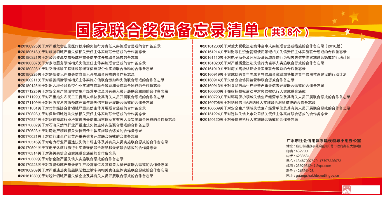 构建信用体系,完善奖惩机制。利用“互联网+大数据”构建信用体系,健全守信联合激励和失信联合惩戒机制。推动市场监督管理局定期发布失信市场主体经营异常名录名单。在省市级文明单位评选中对存在严重失信行为的申报单位“一票否决”。在社会重点领域,建立严重失信黑名单和行业禁入制度,让失信者“一处失信、处处受限”。广水市信用办专项治理政府领域机构失信问题3家。今年上半年市人行征信查询系统成功受理信用报告查询企业226笔、个人3698笔,广水市法院上传执行管理系统严重失信名单79件,广水市市场监督管理局清理吊销长期停业未经营企业17户,广水市信用办推进国家38个联合奖惩备忘录清单落地落细落实,上传信用承诺公开公示238份,督办各部门落实信用修复55条。