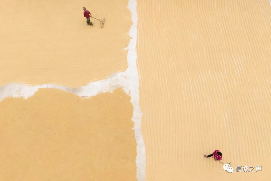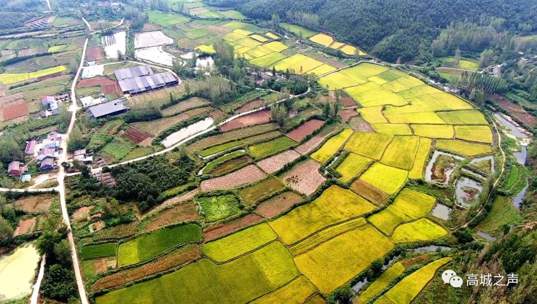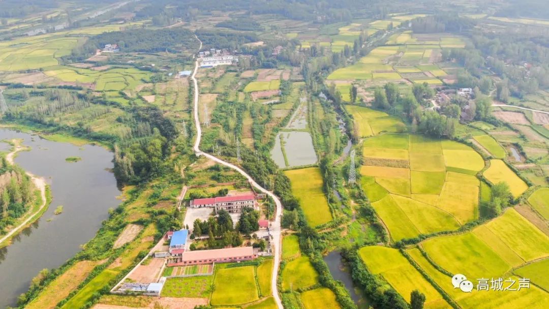 鸟瞰高城大地,白墙红瓦,小桥流水人家。丹桂飘香,田野金黄,好一幅田园诗画。