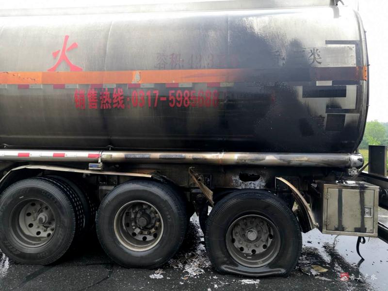 经初步了解,事故原因是由于罐车连续长时间行驶,轮胎和刹车片过热,最终导致罐车轮胎起火。