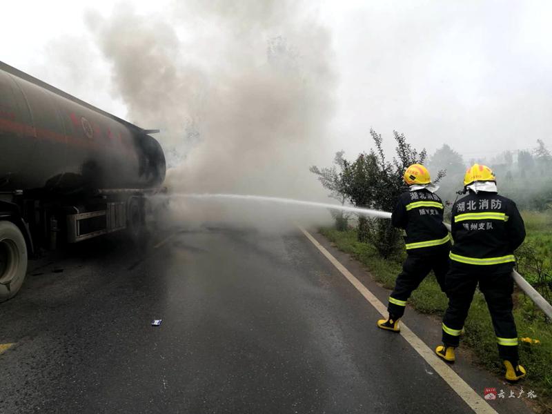 9月29日早上8点20分,随州市消防救援支队接到报警称:位于广水市航空路201省道上有一辆满载30吨汽油的油罐车轮胎起火,无人员被困,情况紧急,急需救援。接到报警后,指挥中心火速调派广水市十里消防站出动3辆消防车和15名消防员赶赴现场。