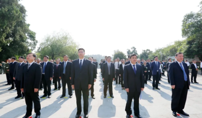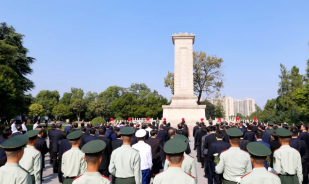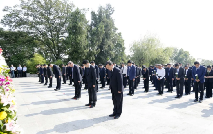 上午10时,在庄严肃穆的气氛中,向烈士敬献花篮仪式开始。随着雄壮的《义勇军进行曲》响起,全场齐唱中华人民共和国国歌。国歌奏唱完毕,全体人员肃立在革命烈士纪念碑前,向为中国人民解放事业和共和国建设事业英勇献身的烈士默哀。