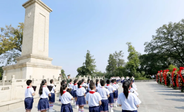 默哀毕,少先队员献唱《我们是共产主义接班人》,并齐致少年先锋队队礼。在《献花曲》激昂深情的旋律中,18名礼兵缓步将9个花篮呈人字形护送至烈士纪念碑前一字排列。