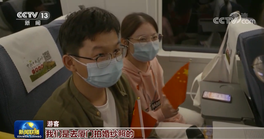 游客:我们是去厦门拍婚纱照的,沿边的风景都很好看,我们刚才把五星红旗跟蓝天还比着,拍了个照片,每天都让我们自己有种爱上祖国新的那种感动。