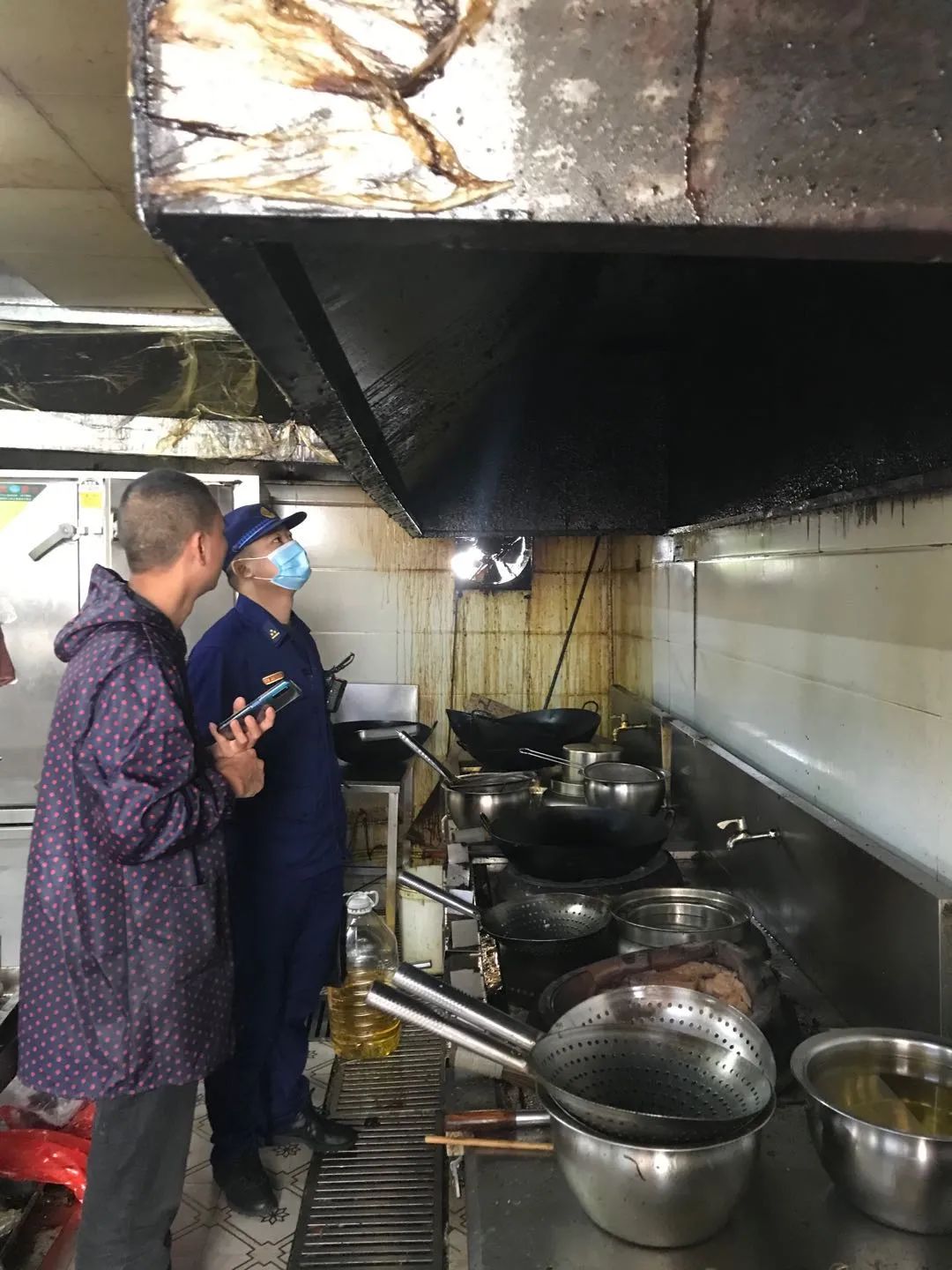 存在问题:1、厨房油烟排放管道上,存在大量的油烟污垢,未及时清除清洗,存在火灾隐患。