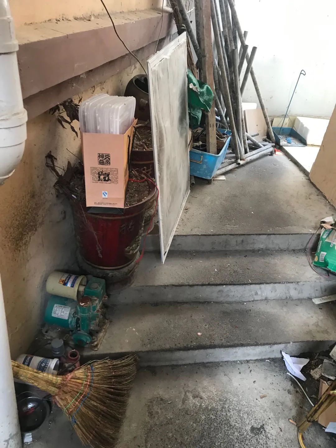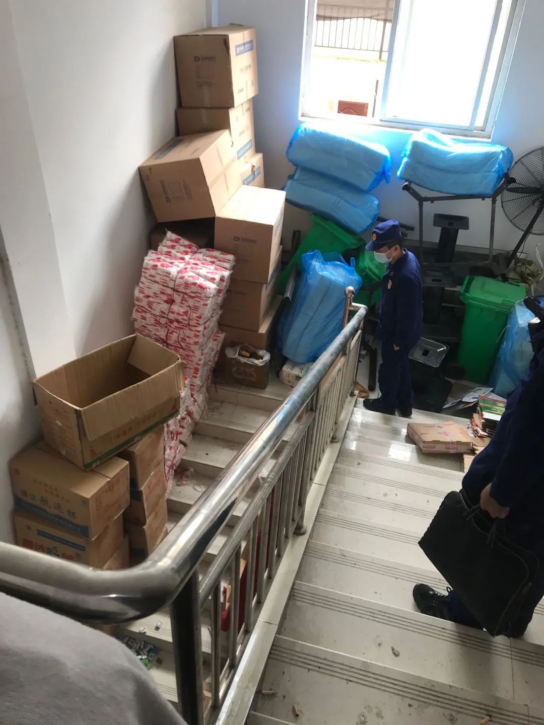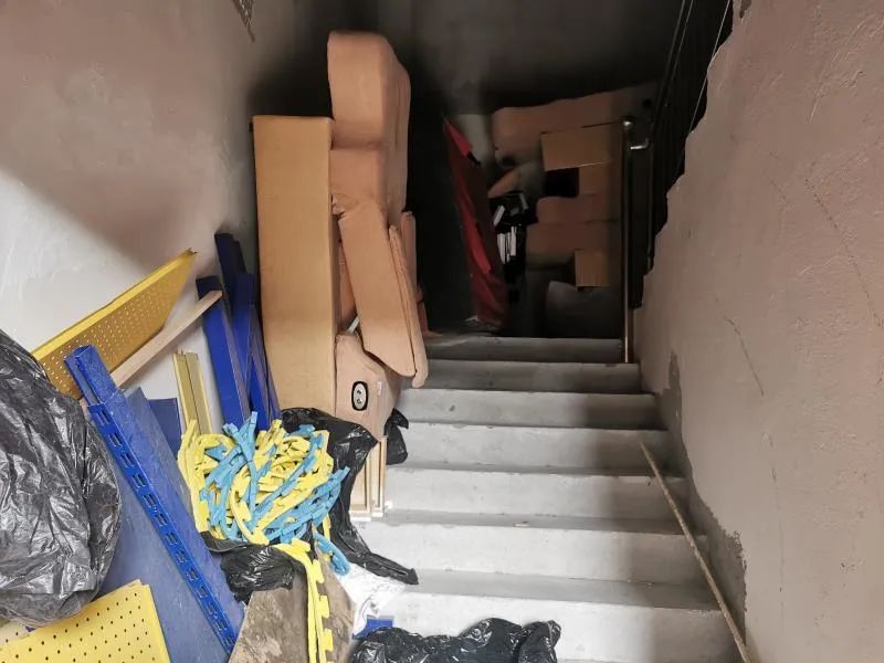 存在问题:1、西侧二楼通向一楼的疏散通道上,存放大量的可燃杂物,通道被占用。