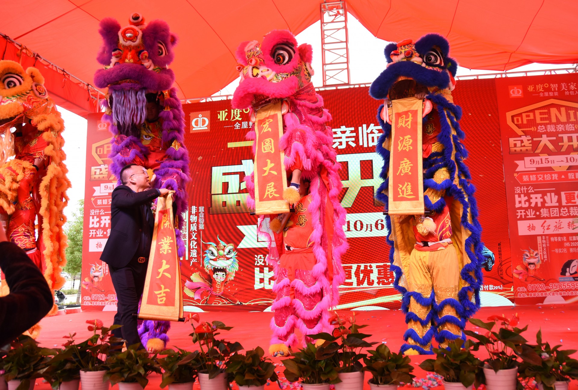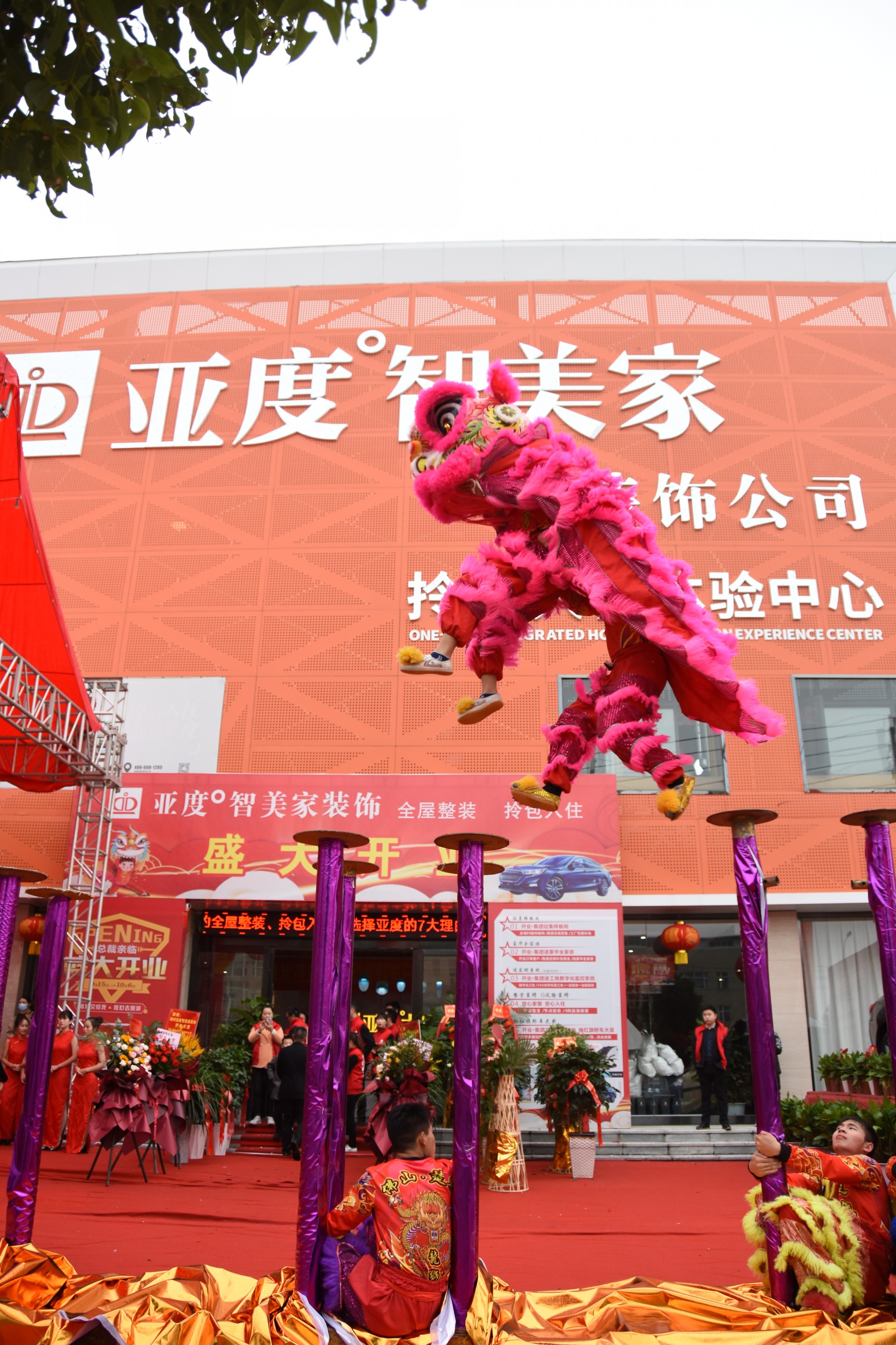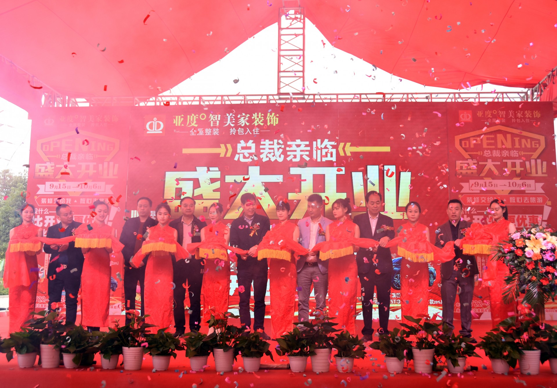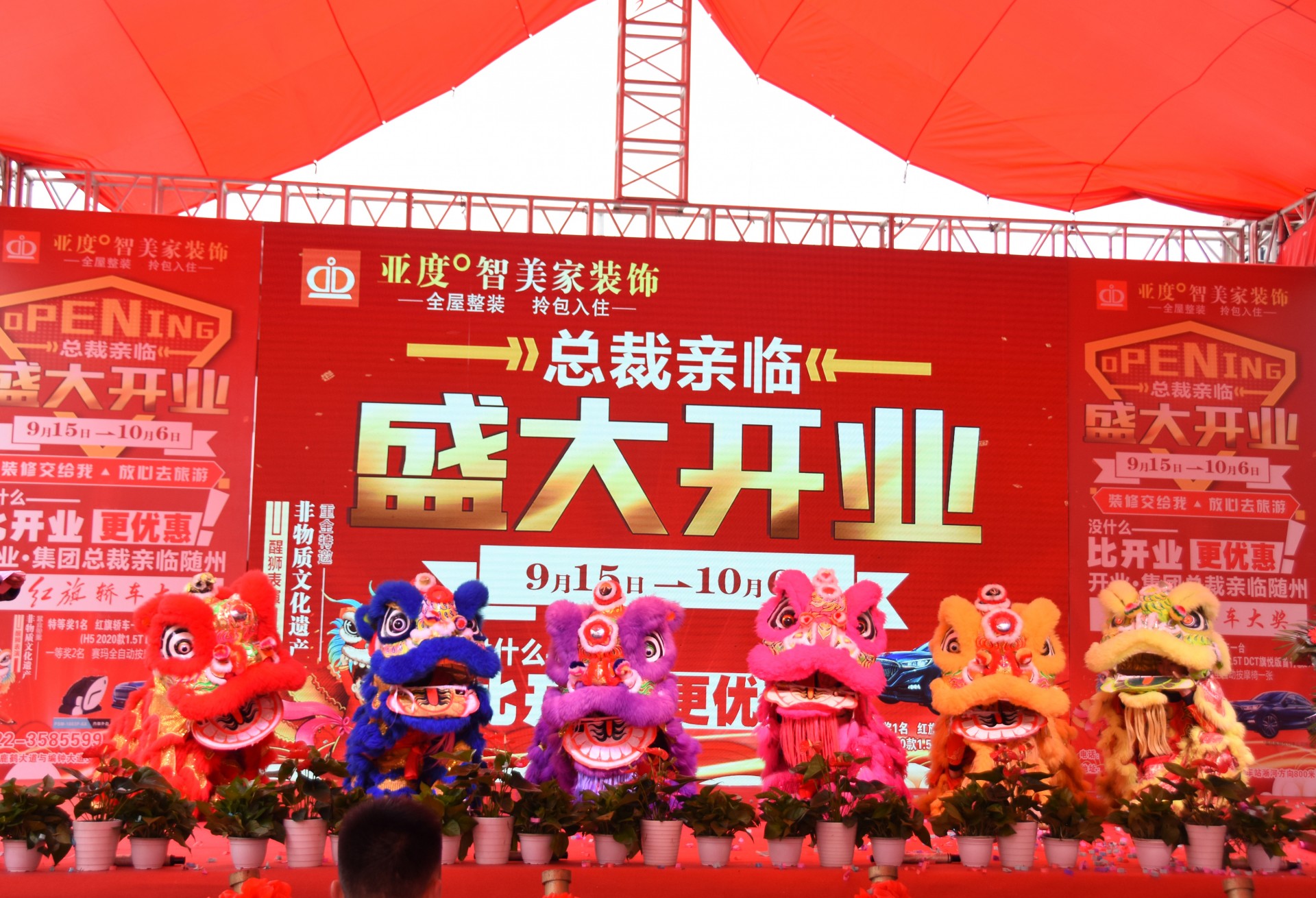 当日,亚度智美家装饰随州旗舰店张灯结彩,锣鼓喧天,歌乐阵阵、热闹非凡。上午9时18分,开业仪式拉开帷幕,在精彩的传统狮舞、开心锣鼓文艺节目表演后,亚度集团董事长杜卫东、随州市建材行业会长刘建先后讲话;随后,亚度智美家装饰随州旗舰店总经理黄亮明致辞。之后,亚度智美家装饰随州旗舰店经营团队亮相,并作激情企业文化展示;品牌合作商代表纷纷登台,集体作庄重承诺宣誓。接着在一阵礼炮声、礼花飞舞中,亚度集团董事长杜卫东、香江商贸董事长姜存海、香江商贸总经理姜存军、随州市建材行业会长刘建,亚度智美家装饰随州旗舰店总经理黄亮明、副总经理熊天国共同为开业剪彩;最后,领导和嘉宾为舞狮点睛。开业庆典仪式圆满结束后,现场丰富的各类文艺节目精彩纷呈,各类抽奖活动,更是掀起阵阵高潮。