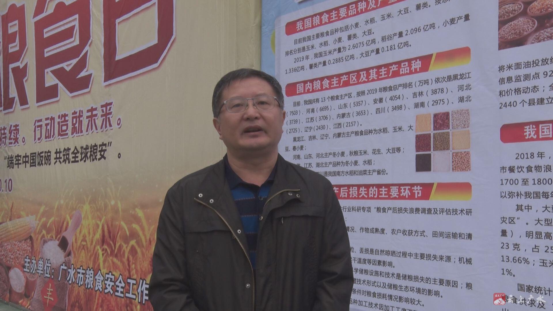 【同期声】广水市发改局党组副书记、广水市粮食安全工作领导小组办公室主任 朱前进:我们开展系列宣传活动的目的,就是要在全市进一步营造爱惜粮食,节约粮食的浓厚氛围,引导广大市民从自身做起,从现在做起,参与到爱粮节粮的活动中来,以我们的实际行动来为国家的粮食安全作出广水贡献。