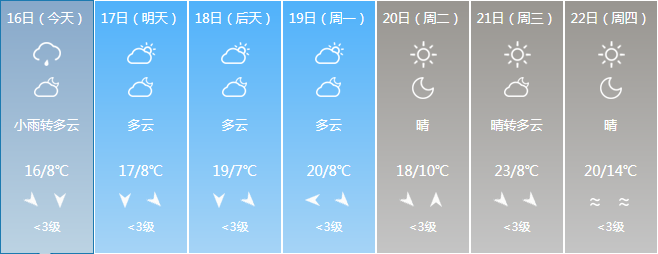明天晚上到后天白天:多云,北风1~2级,最高气温:18~19℃;最低气温:7~8℃