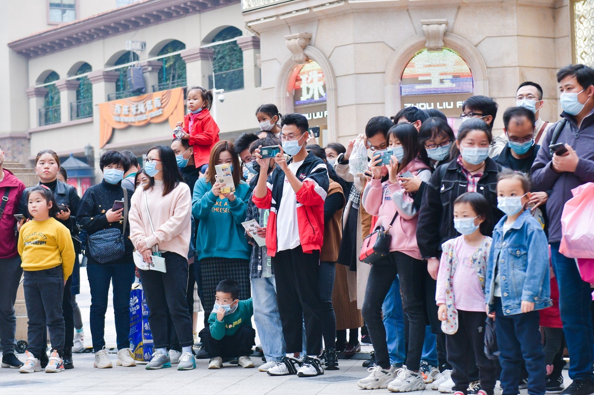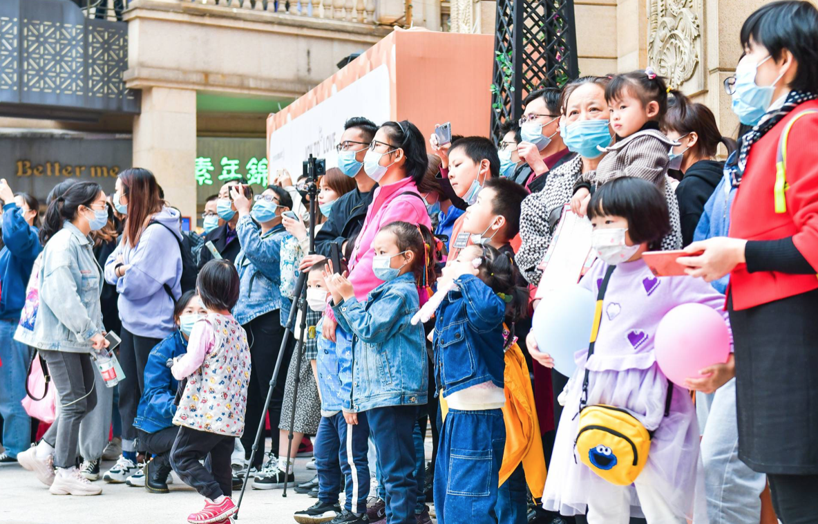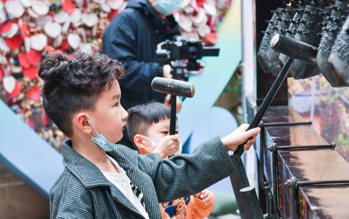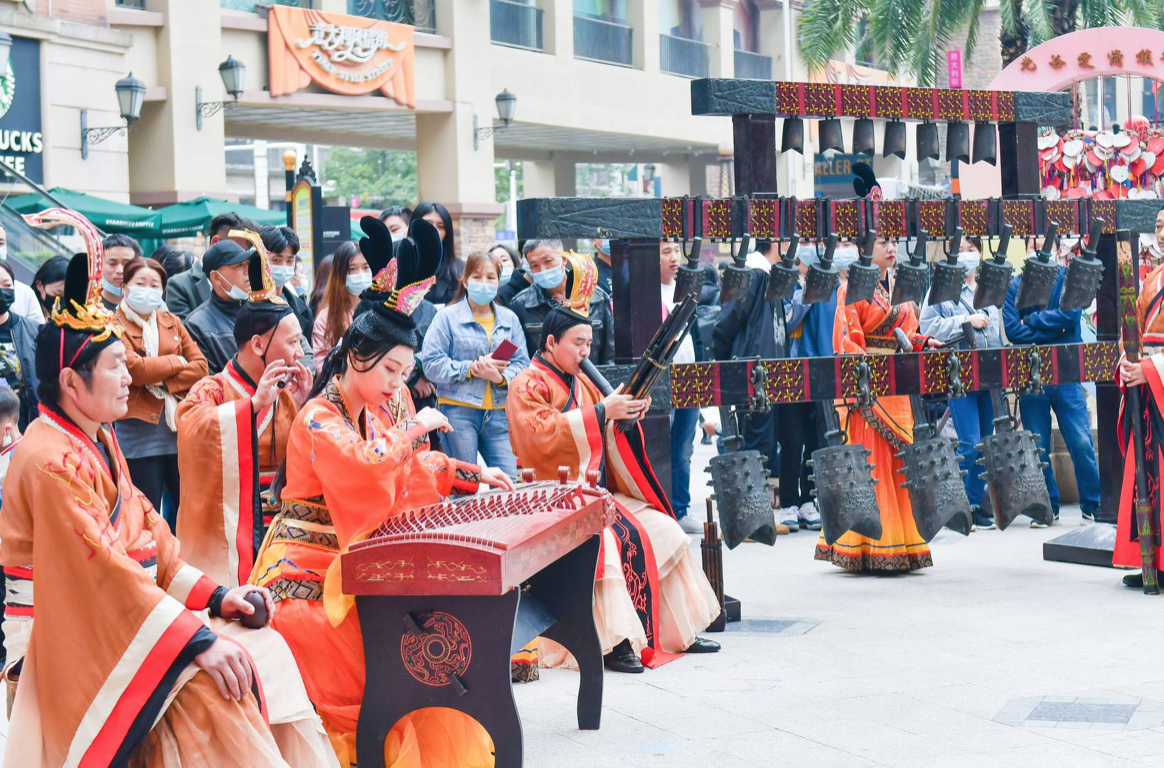 下午4时,编钟乐舞快闪巡演来到武汉年轻人聚集地光谷步行街。演员们身着古代华丽服饰,敲击编钟,曲调欢畅,编磬和鸣,结合舞者翩跹舞姿、将古曲精髓完美呈现。在欧式建筑背景的映衬下,一声声古典悠扬的钟声响起,古典与现代的碰撞吸引了无数目光。