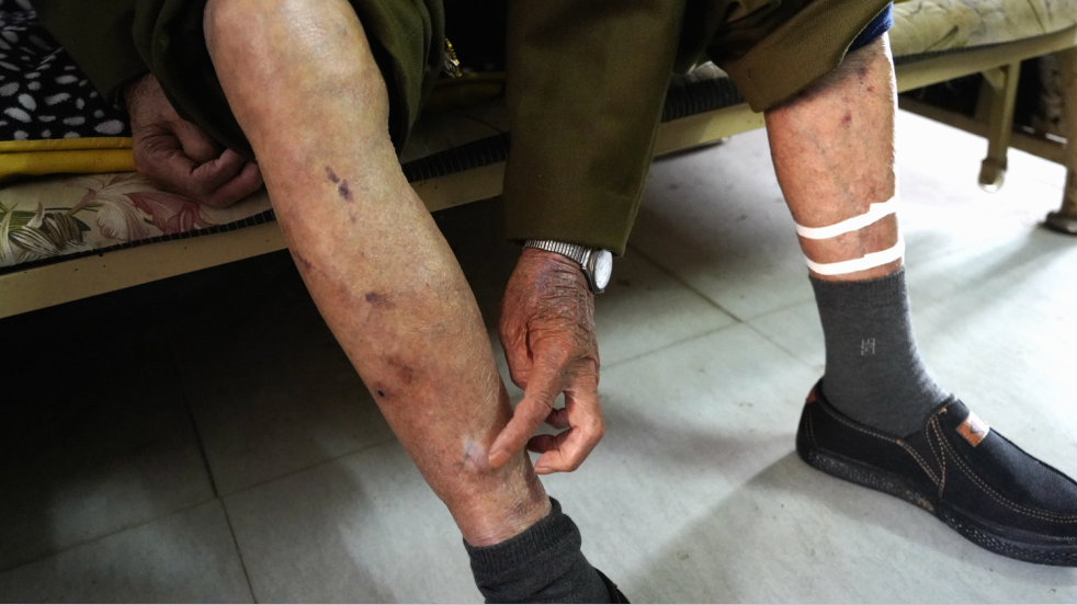 李明海的右脚脚踝和右腿腘窝有两处伤疤,一旁的小儿子李学超指着父亲腿上的两处“勋功章”说道:“我爸几乎从来不主动给我们兄妹6人讲抗美援朝的故事,但他有了孙子后,一听说孙子有当兵的意愿,倒是愿意聊一下,分享点儿心得。”