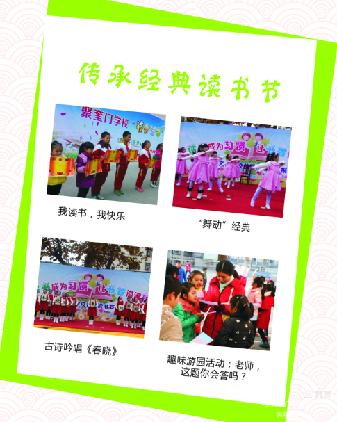 “传承经典读书节” 每年11月,学校举办为期一个月的读书节活动,开展“征文比赛”、 “优秀图书角评比”、“百科知识游园”、“古诗词考级评定”等系列活动。