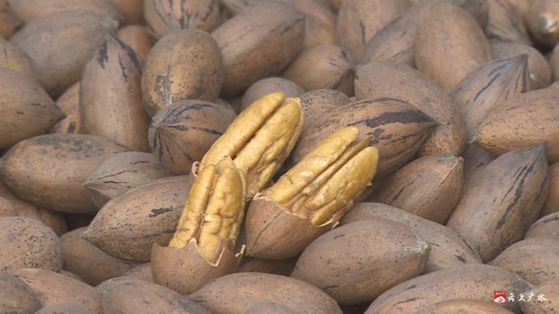 碧根果学名叫薄壳山核桃,原产于美国和墨西哥,由于其果大、壳薄、营养价值高,又有保健作用,是世界上重要的干果树种之一,市场前景广阔。2004年冬季夏建林独自背着100株从云南省林科院购进的树苗,在山里尝试种植,施肥、浇水、防虫配合简单的修枝,他每天观察特性、花期,进行互相授粉、品种搭配,这一待就是15年。如今100株核桃苗已经长成核桃树枝繁叶茂,这里也成为了能提供优质薄壳山核桃苗的种质资源圃。