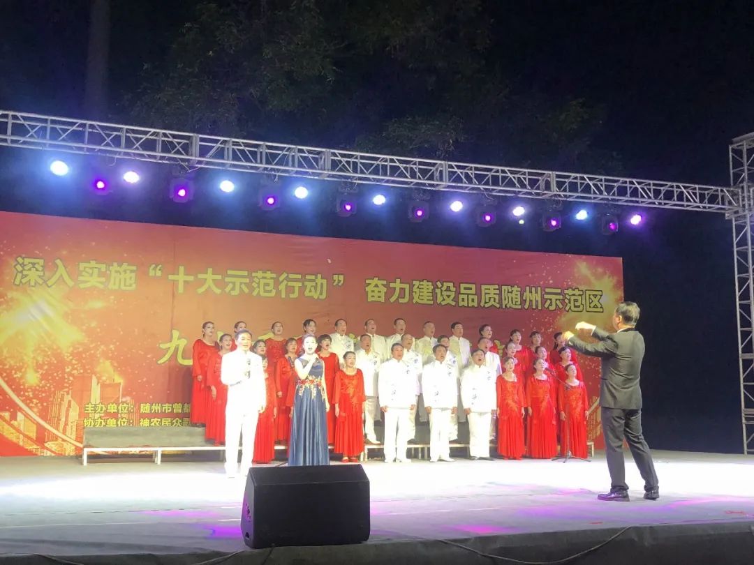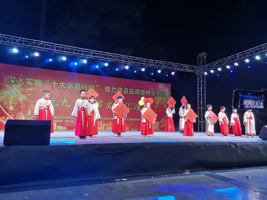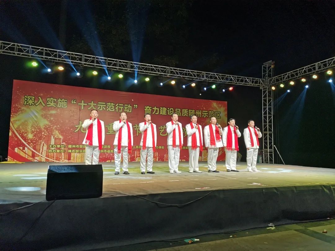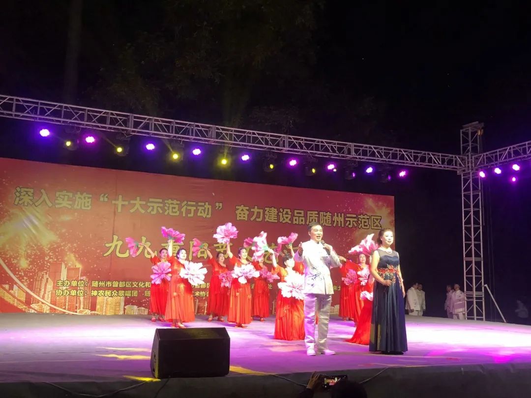 10月25日晚,曾都区文化和旅游局、曾都区西城街道办事处、曾都区西城街道飞来土社区联合主办的“深入实施‘十大示范行动’、奋力建设品质随州示范区”九九重阳节文艺汇演在神农公园广场隆重举行。