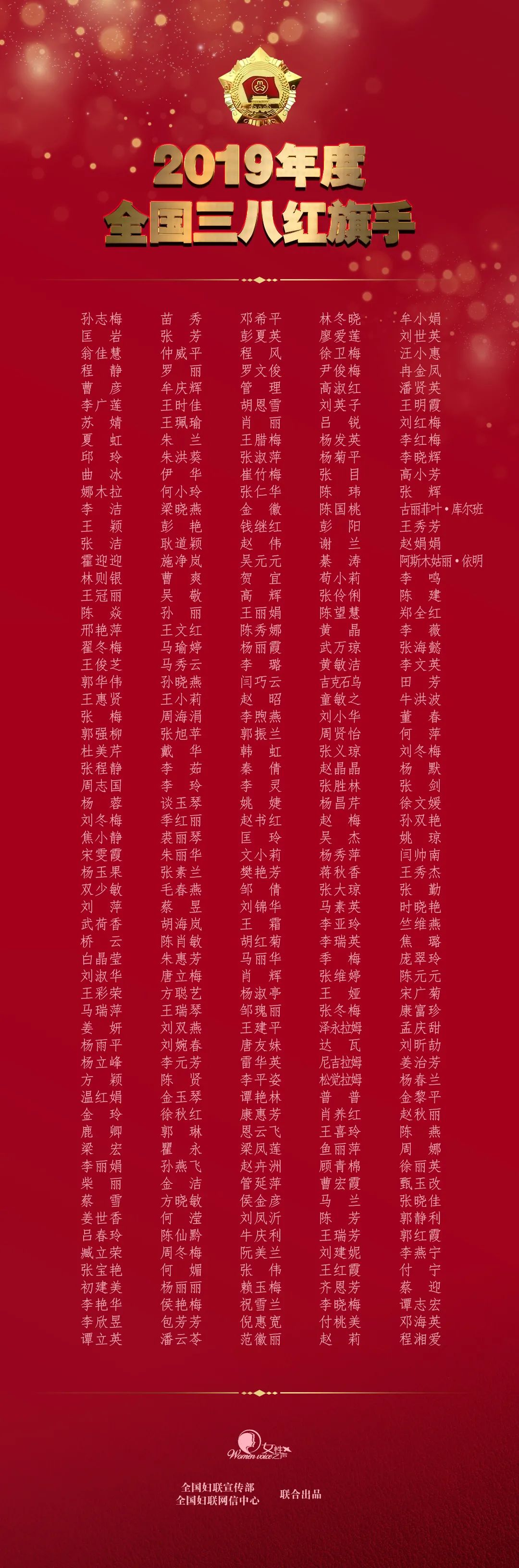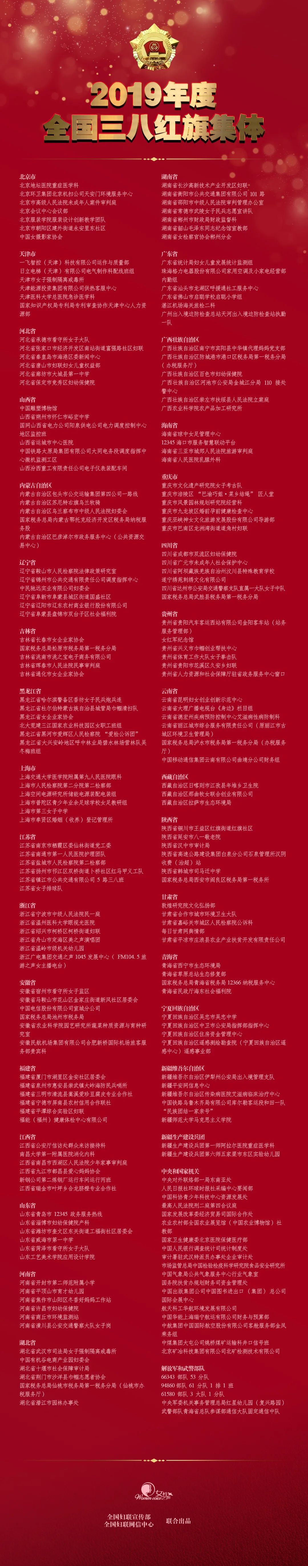 日前,全国妇联决定,授予朱婷等10人(组)优秀女性2019年度全国三八红旗手标兵荣誉称号。同时,授予孙志梅等300人全国三八红旗手荣誉称号,授予北京地坛医院重症医学科等200个单位全国三八红旗集体荣誉称号。