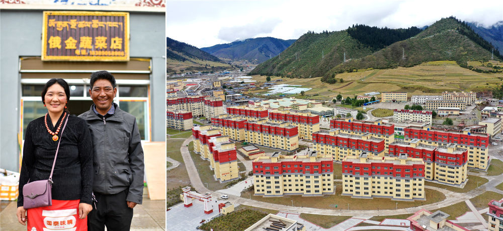 2020年9月22日拍摄的拼版照片:左图为西藏自治区昌都市类乌齐县长毛岭乡达雄村村民俄金(右)和妻子阿丁在安置点俄金蔬菜店前;右图为类乌齐县桑多扶贫开发区易地扶贫搬迁安置点一角(无人机照片)。新华社记者 詹彦 摄