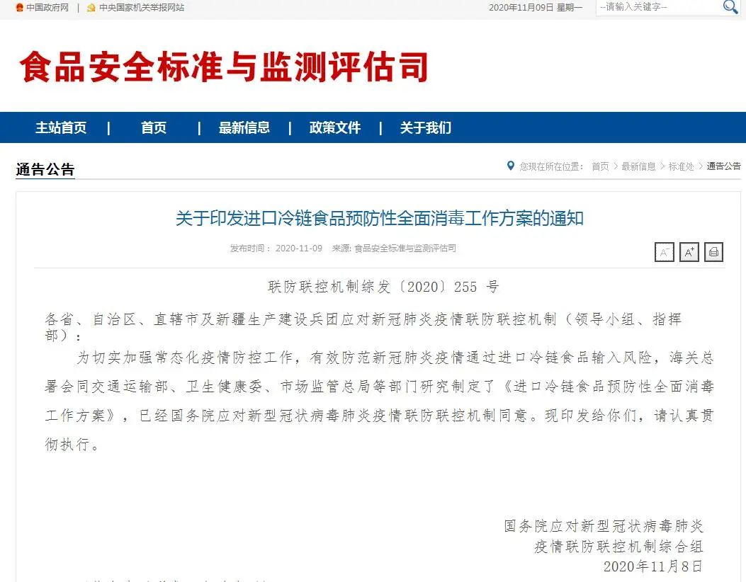 《关于印发进口冷链食品预防性全面消毒工作方案的通知》11月9日发布。