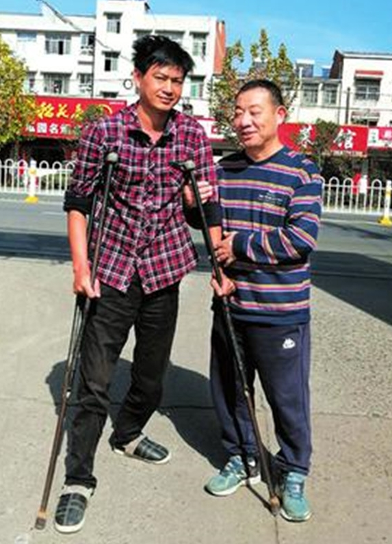 刘光全(右)搀扶残友进行康复训练