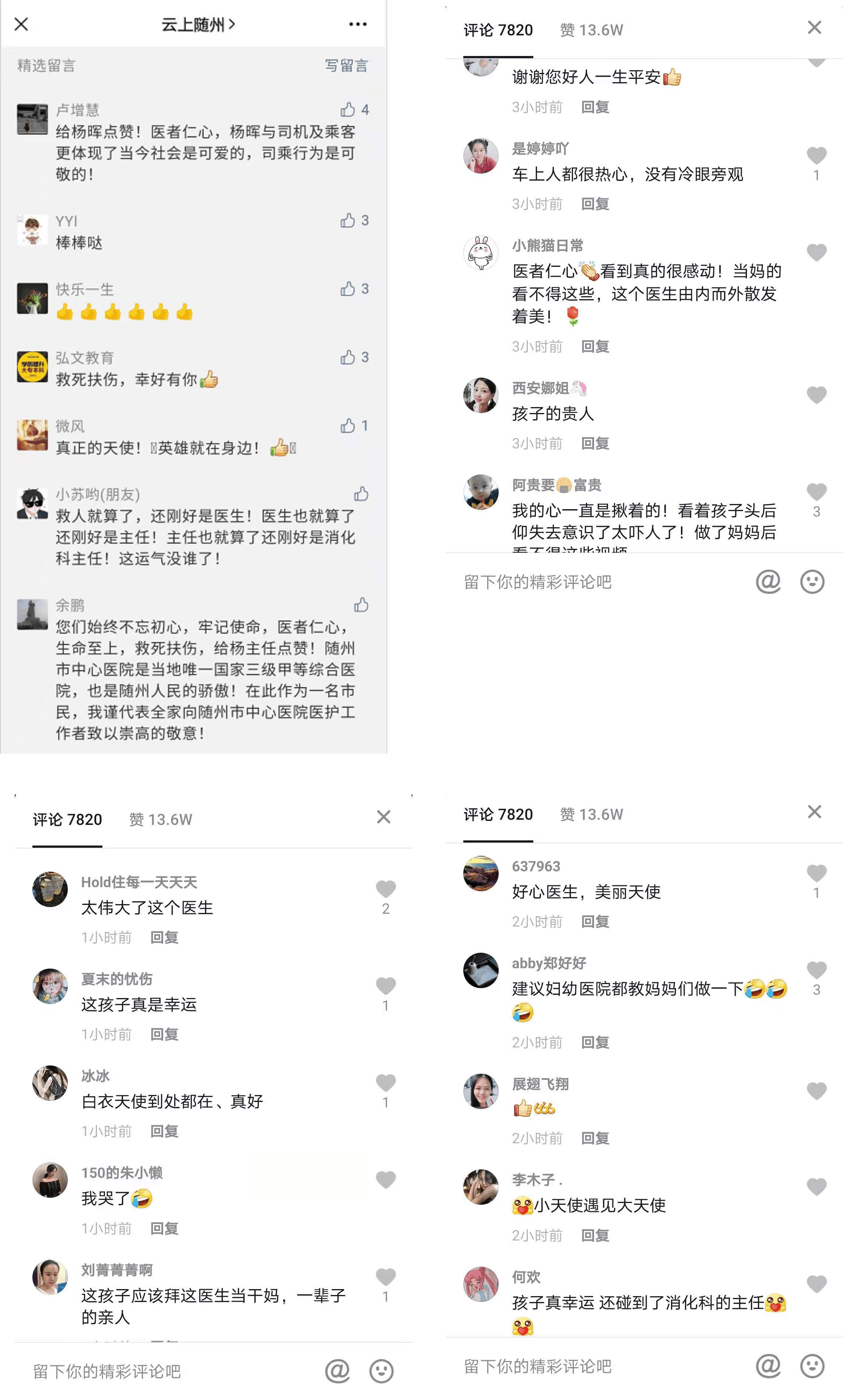 不仅是主流媒体,云上随州官方抖音号、微信、头条号等新媒体平台也纷纷报道转发。仅抖音平台,就收获了302.6W的播放量、13.6W的点赞量、7805条留言及4582条转发。众多网友纷纷点赞,评论正能量满满。